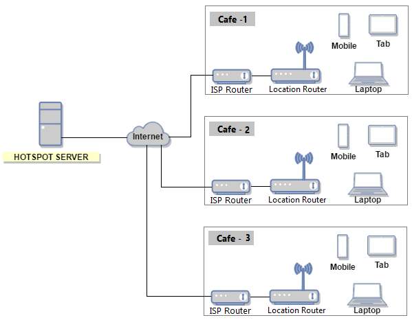 Chain-of-Cafes usually prefers the software to be installed in a cloud server, and in each location there will be a location-router with inbuilt WiFi ports, working in-tandem with hosted sms server, for sending OTP to the visitors for their limited Internet access. The access-log can be stored either in the usb-storage attached to the location-router or in the cloud server.